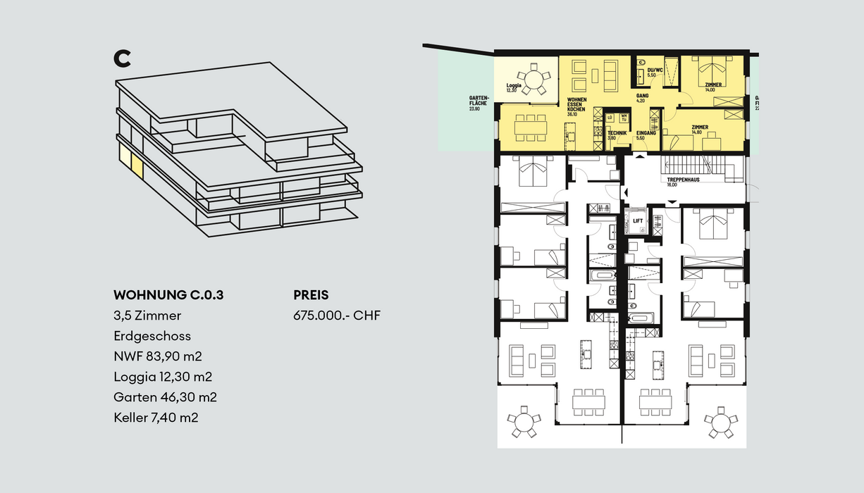 Die unterschiedlichen Wohnungsgrössen, von 2,5 - bis 4,5 Zimmer, verfügen alle über eigene Aussenräume, teils mit Gartenfläche.